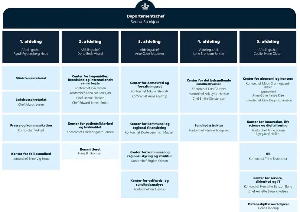 Departementets arbejsområder er inddelt i 5 afdelinger.